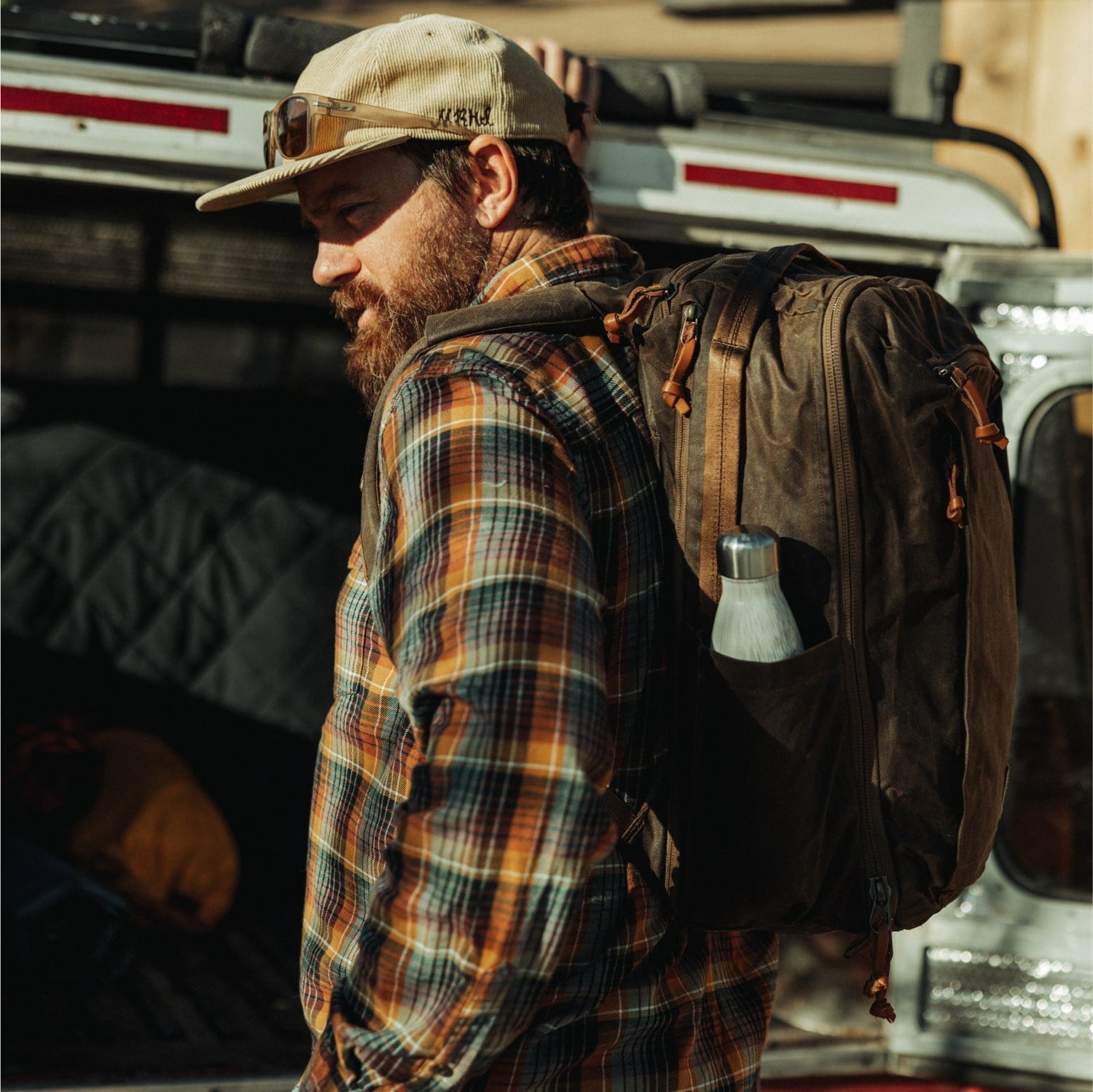 EVERGOODS fan-favorite travel backpack in a custom waxed canvas shell