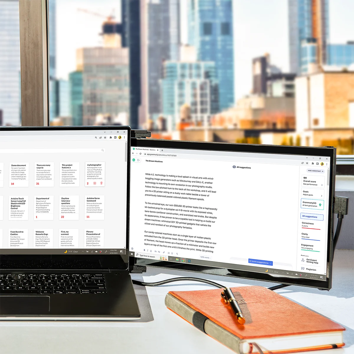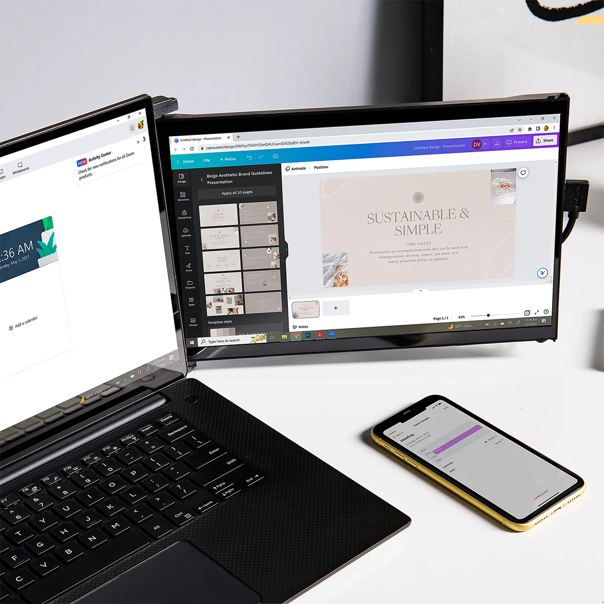 Duex Max DS is our most upgraded, portable dual-screen laptop accessory that makes multitasking effortless. To give laptop users a more perfect laptop dual screen user experience, this portable laptop monitor is 14.1" large screen, 0.25" at thinnest point , only 1.8lb lightweight for true mobility, and make you work faster while improving the quality of your work.