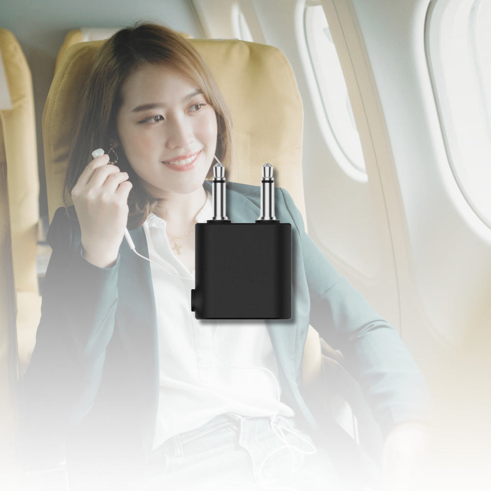 Most airlines seats come with dual-pronged audio ports. Duodio adaptor allows you to connect the in-flight enternatinment audio output to AirFly Pro's single audio port, so that you can use your own Bluetooth Earphone/Headsets for better in-flight experience.