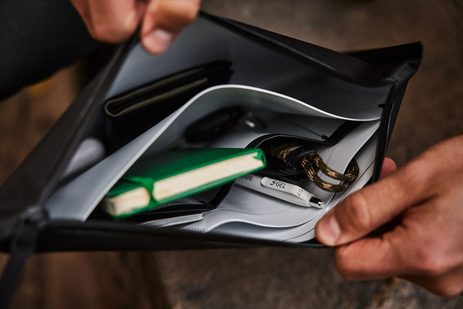 Minimalist yet substantial, utilitarian but still elegant; the ELEMENT Drop In is an essential weatherproof tool in your carry arsenal. Backed by 3+ years of internal R&D efforts, EDI is constructed using radio frequency welding and flat bonding techniques. This is made possible by a custom-developed solution-dyed black textile with a TPU laminate and kiss-coated face. Despite its slim appearance, our signature 3D patterning, mobile dividers, and drop-in slots allow EDI to flex to hold a myriad of everyday and travel loadouts: travel essentials to tech items to even camera kits.