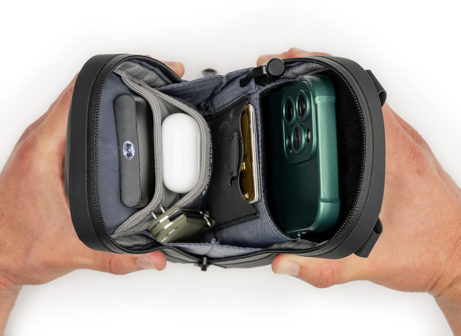 Store your phone, airpods, credit cards, passport and all your other small daily essentials.