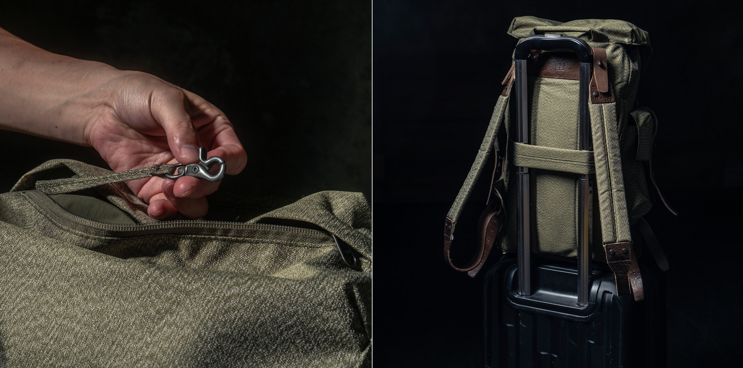 • The canvas exterior is treated with a water-repellent coating that repels over 90% of water droplets, while the interior is PU-laminated to ensure your belongings remain protected in various environments.