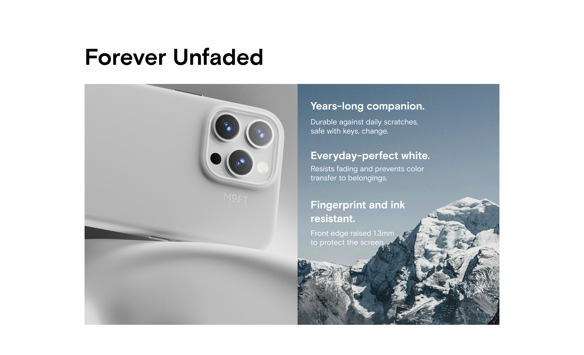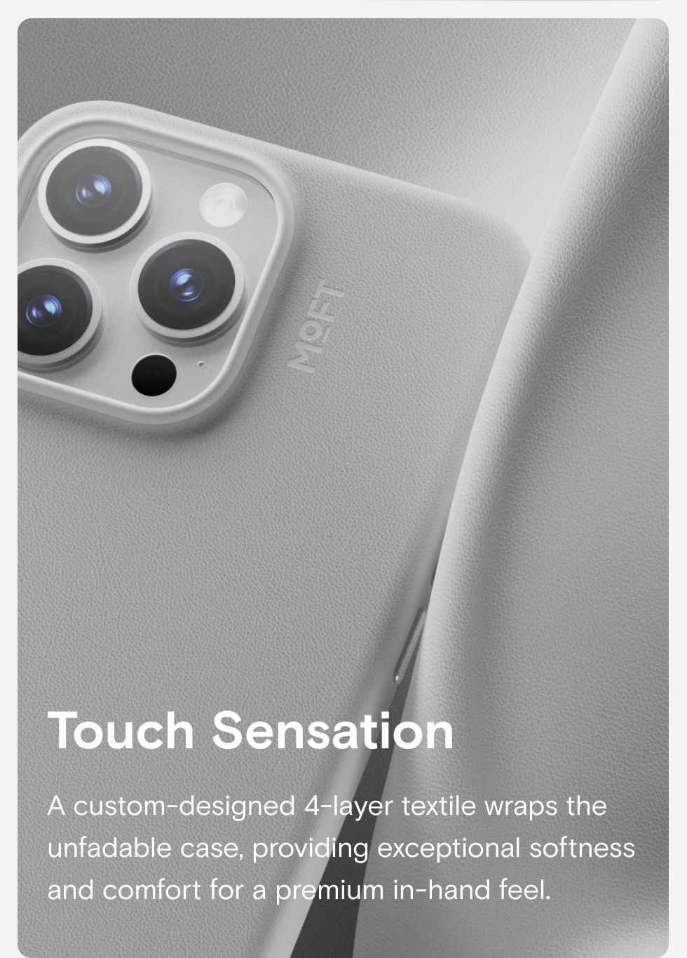 A custom-designed 4-layer textile wraps the unfadable case, providing exceptional softness and comfort for a premium in-hand feel for your iPhone 16. The strong magnetic mount seamlessly pairs with all MOFT accessories, while timeless colors provide versatile styling options to enhance your everyday look.