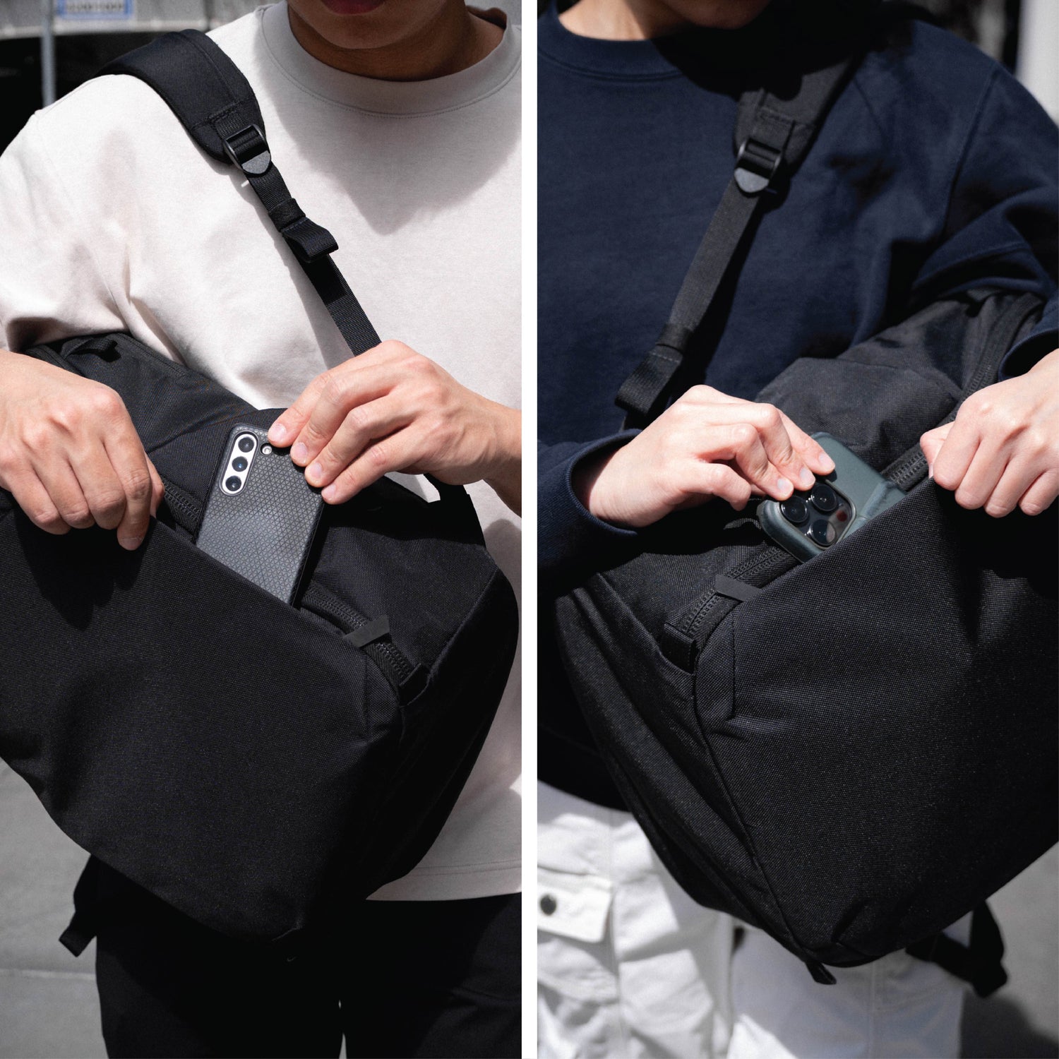 An ambidextrous side access pocket with hidden zipper tracks on the left and right to allow quick, on-body access to your essentials.