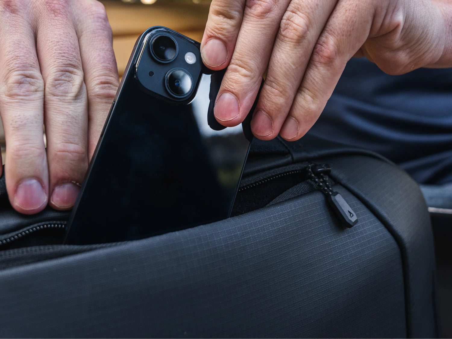 On the side of the sling there is a water bottle pocket that hides away when not in use. The wide, comfortable strap provides a secure carry and features a card slot for quick access to public transit cards or swipe cards for your office. The back of the bag has an EVA formed foam panel for added comfort and breathability. There is also a luggage handle pass-through sleeve on the back for seamless integration with roller luggage during travel.