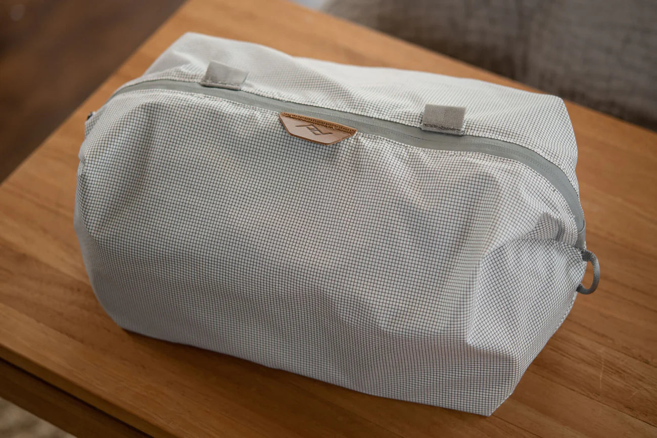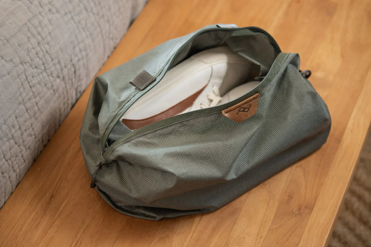 Strong, ultralight, and ultra-packable, Shoe Pouch provides basic storage for shoes or clothes. Works great with any suitcase or bag, and sized to fit perfectly into any bag in the Peak Design Travel Line. Uniquely patterned from a single piece of self-healing 70D nylon, the Shoe Pouch weighs in at a feathery 48g. When you’re not using Shoe Pouch, stow it in the integrated storage pouch. A perfect little bag to have on-hand in case you need more storage or organization mid-trip. Typically fits 1-2 pairs of shoes, depending on size.