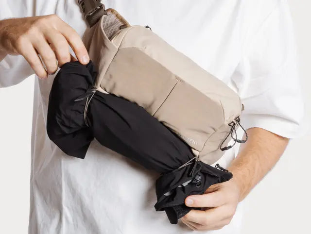 - Jacket & Tripod Lash Straps - Bungee clip cable allows you to hold a tripod, poles, a small water bottle, or a jacket to the outside of your sling.
