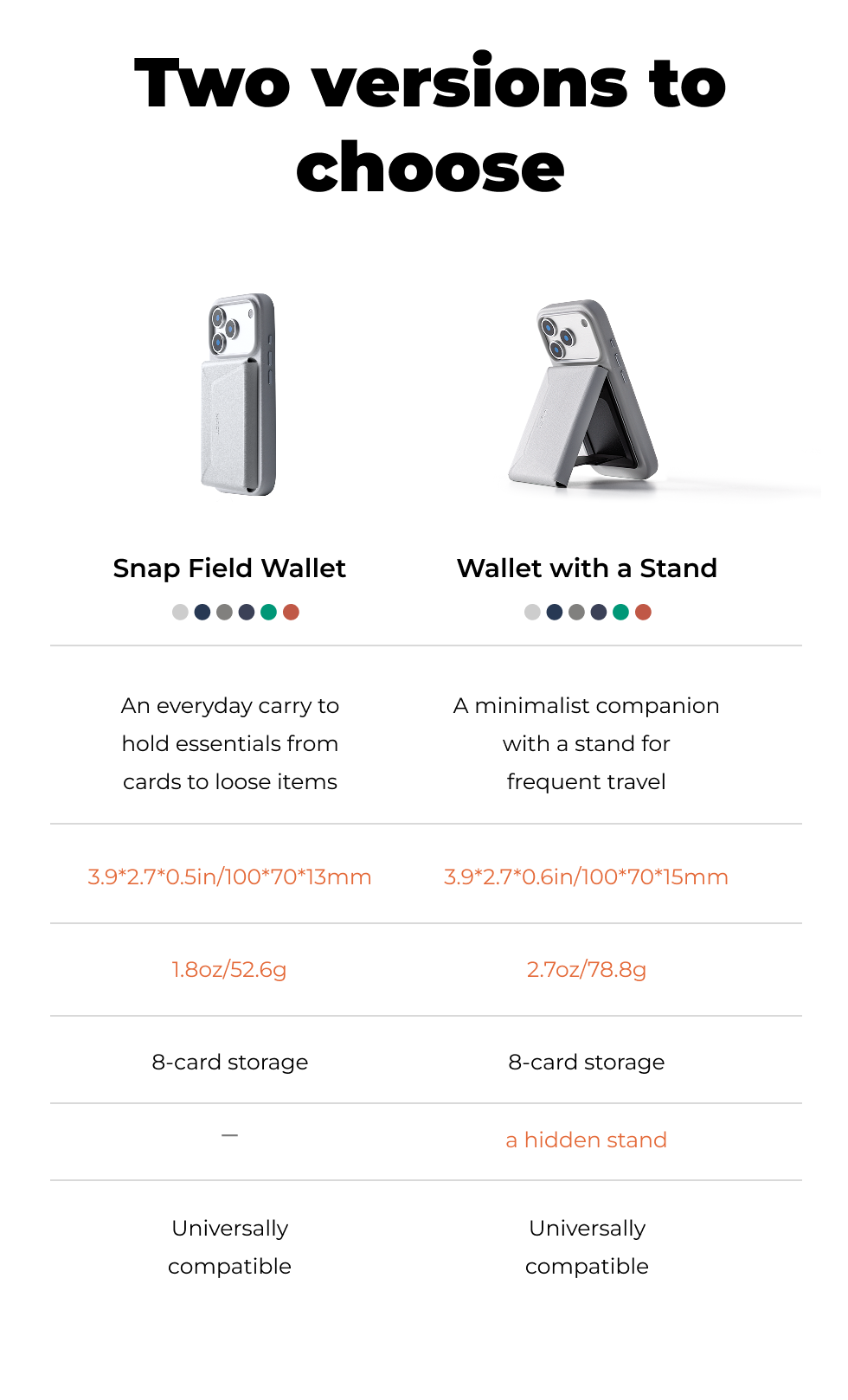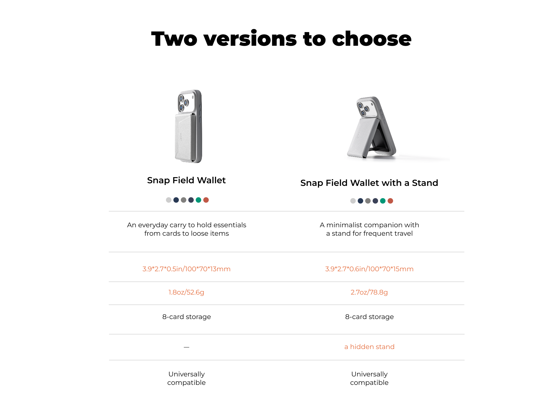 Slim, smart, and versatile — the Snap Field Wallet combines minimalist design with practical functionality. Crafted with MOVAS™ vegan leather and reinforced with fiber-glass, magnets, and metal accents, it’s built to last. It holds up to 8 cards (or about 4–6 cards plus small items) and features RFID-blocking protection to keep your information safe.
